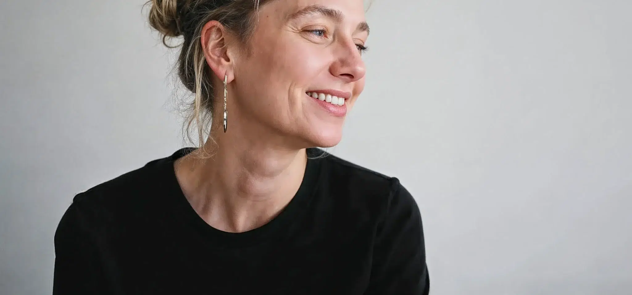 Woman with blonde hair smiling warmly in a minimalist portraitWoman with blonde hair smiling warmly in a minimalist portrait